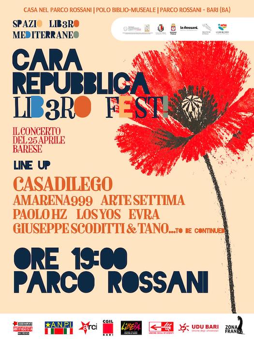 e attraverserà corso Cavour, via Carulli e via Capruzzi, fino ad arrivare a parco Rossani alle 19. All’arrivo del corteo inizierà il concerto “Cara Repubblica Lib3ro Fest” che proseguirà fino all’una. Si esibiranno Arte Settima, Giuseppe Scoditti & Tano, Evra, Casadilego, Amarena999, Paolo HZ e LosYos, alternati a interventi politici. Sono previste anche esibizioni di alcune realtà artistiche musicali che fanno parte della ATS dello Spazio Lib3ro Mediterraneo. Nel parco saranno allestiti gli stand delle associazioni e nel Polo Biblio-Museale una mostra antifascista con fotografie e opere d’arte.