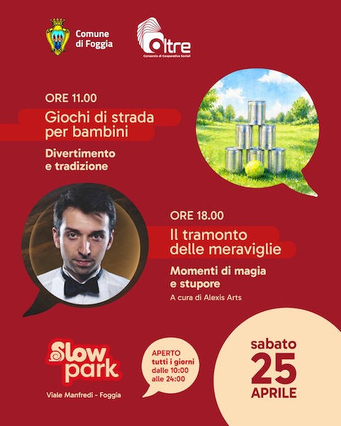 Si comincia la mattina alle ore 11.00 con i “Giochi di strada per bambini”, un evento pensato per far riscoprire il piacere del gioco semplice e condiviso. Un percorso a tappe con postazioni guidate da operatori che accompagnerà famiglie e piccoli in un viaggio tra i giochi di una volta: dalla trottola al bowling con i barattoli, dal tiro dei tappi al Forza 4 gigante. Si prosegue poi alle ore 18.00 con “Il tramonto delle meraviglie”, a cura dell’illusionista-fantasista Alexis Arts. Sarà un’occasione per vivere momenti di magia e stupore per immergersi in un’esperienza interattiva in cui lo stupore incontra l’atmosfera suggestiva del tramonto, trasformando il tempo in magia. Un format che fonde arte, illusionismo e narrazione in un viaggio emozionale, dove il pubblico diventa protagonista della meraviglia.