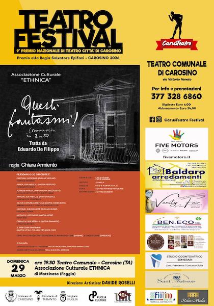 Alle ore 19.30 di domenica 29 marzo, presso il Teatro Comunale di Carosino (ticket 6 €), la Compagnia Teatrale La Maschera dell’Associazione Culturale Ethnica di Mattinata, porta in scena, con la regia: di Chiara Armiento, un adattamento di “Questi fantasmi”, la celebre commedia di Eduardo De Filippo.