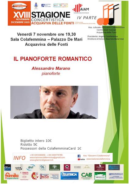 Venerdì 7 novembre, a Palazzo de Mari ad Acquaviva delle Fonti, per l’associazione Colafemmina , Alessandro Marano eseguirà musiche di Chopin, Liszt e Musorgskij