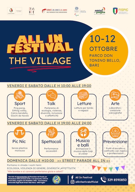 Dal 10 al 12 ottobre, il Parco Don Tonino Bello di Bari diventerà dunque un villaggio dell’inclusione: tre giornate di eventi gratuiti tra laboratori, sport, spettacoli, talk e parate, al fine di promuovere i diritti e la cittadinanza attiva (il programma completo nella locandina in allegato).