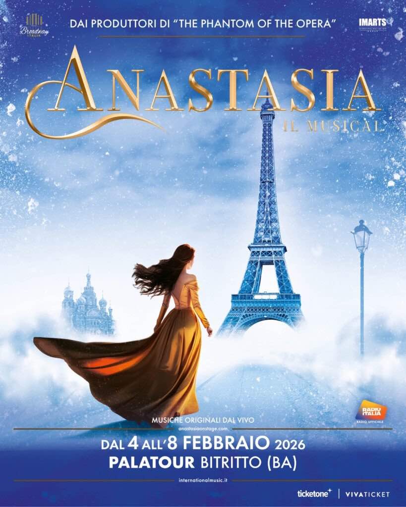 BITRITTO (BA) – Da mercoledì 4 a domenica 8 febbraio 2026, al Palatour di Bitritto, andrà in scena “Anastasia – Il Musical”, uno spettacolo per tutta la famiglia, capace di far sognare grandi e piccoli. Ispirato dalla Twentieth Century Fox Motion Pictures per accordo speciale con Buena Vista Theatrical e dall’opera teatrale di Marcelle Maurette adattata da Guy Bolton