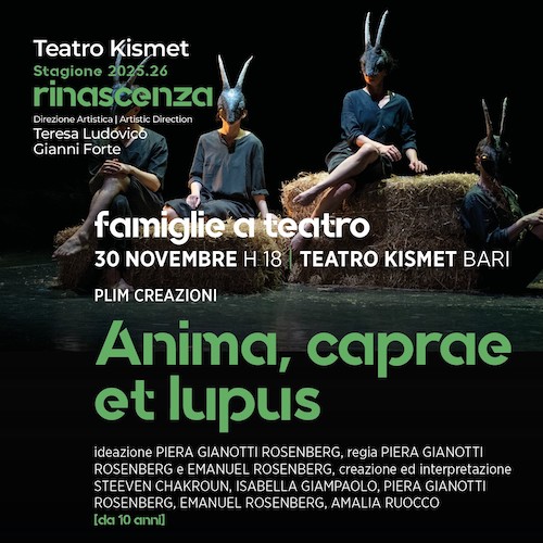 BARI – Domenica, 30 novembre 2025, alle ore 18.00, al Teatro Kismet di Bari, prenderà il via la Stagione Famiglie a teatro 2025-26 con la co-direzione artistica di Teresa Ludovico e Gianni Forte per Teatri di Bari. Lo spettacolo inaugurale è Anima caprae et lupus, consigliato dai 10 anni in su, che mescola sapientemente narrazione e riflessione su natura, istinto e trasformazione, in un intreccio tra passato e presente.