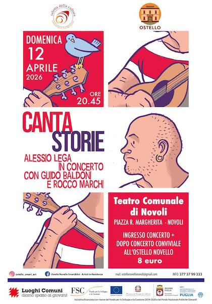 Domenica 12 aprile, al Teatro Comunale di Novoli, in Canta storie si esibiranno oltre ad Alessio Lega, Guido Baldoni e Rocco Marchi