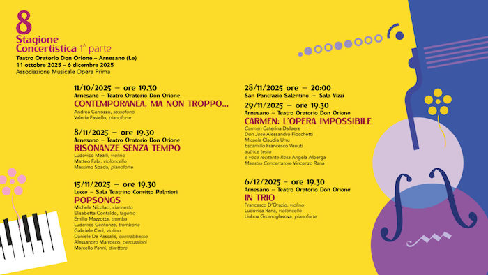 L’11 ottobre 2025 prende il via l’ottava  Stagione Concertistica di Opera Prima nel teatro di Arnesano  con “Contemporanea ma non troppo…”. Andrea Carrozzo al sassofono e Valeria Fasiello al pianoforte in un programma che spazia da Debussy a compositori del nostro tempo