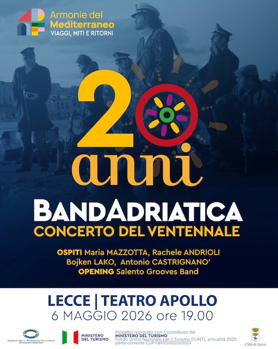 LECCE – Non un semplice anniversario ma un appuntamento speciale che sarà molto più di un concerto. Mercoledì 6 maggio, alle ore 20.00, al Teatro Apollo di Lecce la BandAdriatica, uno dei progetti più originali e riconoscibili della world music italiana, celebra i suoi primi vent’anni di musica, incontri, viaggi e attraversamenti culturali. Una festa collettiva, con tante e tanti ospiti, costruita come un itinerario nella storia della band e nel suo immaginario sonoro: un universo musicale meticcio e in costante evoluzione, nel quale la tradizione popolare si fa materia viva e contemporanea, aperta al dialogo tra culture, memorie e geografie. Un’identità in continua trasformazione, che ha portato il gruppo a esibirsi in numerosi festival internazionali di rilievo.