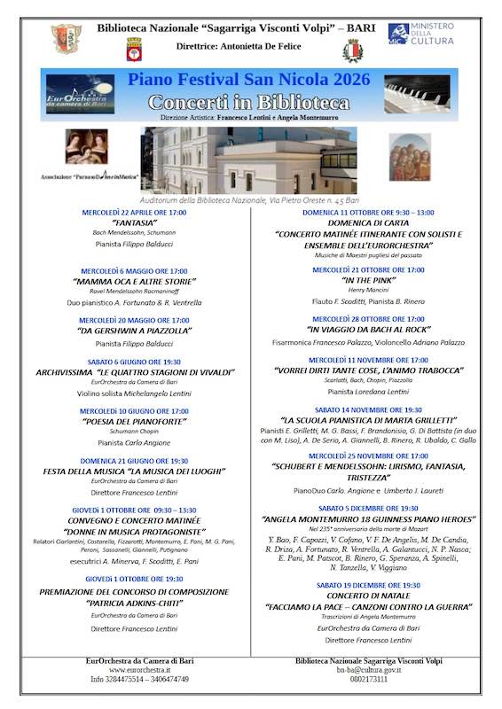 La Stagione 2026 dei “Concerti in Biblioteca” è organizzata in sinergia tra EurOrchestra e la Biblioteca Nazionale di Bari