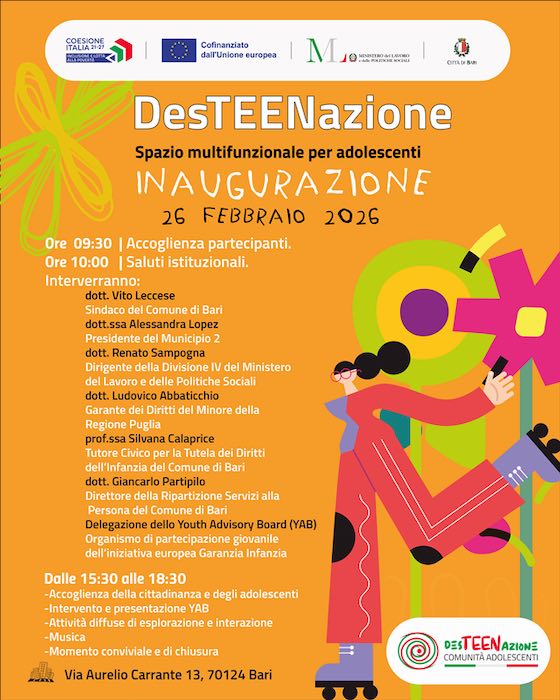 All’inaugurazione, assieme a una delegazione di 4 ragazzi dello Youth Advisory Board (YAB), l’organismo consultivo di partecipazione giovanile istituito nel dicembre 2021 da UNICEF in collaborazione con il ministero del Lavoro e delle Politiche sociali e il dipartimento per le Politiche della Famiglia della presidenza del Consiglio dei Ministri, interverranno il sindaco Vito Leccese, il dirigente della divisione IV del ministero del Lavoro e delle Politiche sociali Renato Sampogna, la presidente del Municipio II Alessandra Lopez, il garante dei Diritti dei minori della Regione Puglia Ludovico Abbaticchio, la tutrice civica per la tutela dei Diritti dell’infanzia del Comune di Bari Silvana Calaprice e il direttore della ripartizione comunale Servizi alla persona Giancarlo Partipilo.