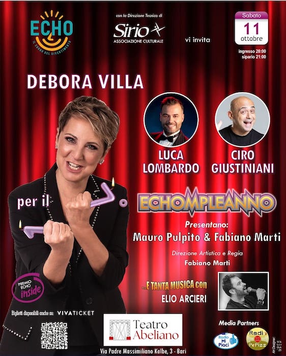 BARI – Sabato 11 ottobre, alle 21, al teatro Abeliano di Bari si terrà “Echompleanno”, una speciale serata di cabaret e musica con la quale si celebreranno i 17 anni di attività dell’associazione culturale Echo Events diretta da Donato Sasso, a cui parteciperanno diversi ospiti tra cui Debora Villa, Luca Lombardo e Ciro Giustiniani.
