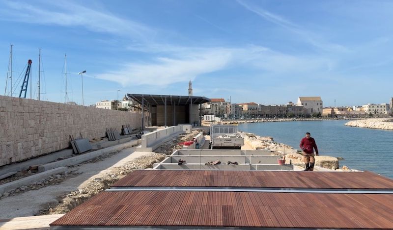 è in corso, infatti, la posa in opera delle pedane in legno, pensate da progetto come piattaforme fisse multifunzionali, che richiederà alcune settimane per essere ultimata. Le pedane saranno collegate alla strada con listoni lunghi 11 metri che consentiranno, in futuro, di fare proseguire la passeggiata in legno per ulteriori metri, a costeggiare Bari vecchia. A verificare l’andamento dei lavori è stato il sindaco, nel corso di un sopralluogo.