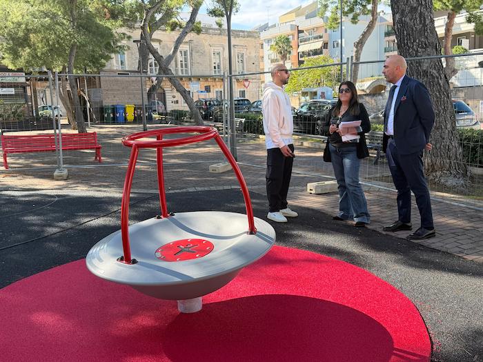 Sono, dunque, stati installati giochi del tipo: gioco a molla a forma di ciotola, torre da gioco con due scivoli, arrampicata e pannello ludico inclusivo, altalena inclusiva con tre sedili, giostra rotante con balaustra, fiore a campana.
