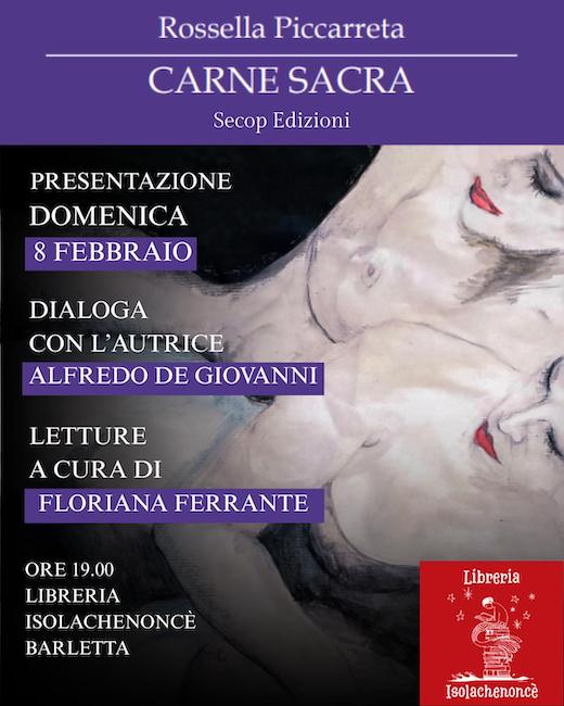 BARLETTA – La Libreria Isolachenoncè è lieta di presentare Carne Sacra, la nuova raccolta poetica di Rossella Piccarreta, domenica 8 febbraio alle ore 19.00 presso la sede di Barletta (Corso Garibaldi, 129).