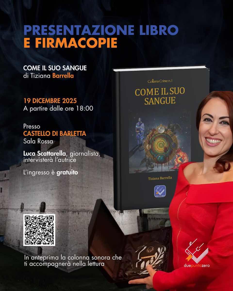 BARLETTA – Venerdì 19 dicembre, alle ore 18.00, nella Sala Rossa del Castello di Barletta (Piazza Castello), si terrà la prima presentazione nazionale del thriller multisensoriale “Come il suo sangue” di Tiziana Barrella, edito da Duepuntozero Edizioni.