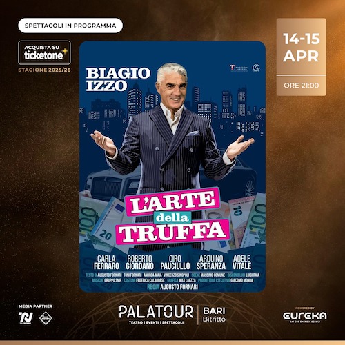 Il 14 e 15 aprile al  Palatour di Bitritto, interpretata da Biagio Izzo, una brillante commedia tra legalità e necessità. Un truffatore per caso e una truffa… a fin di bene