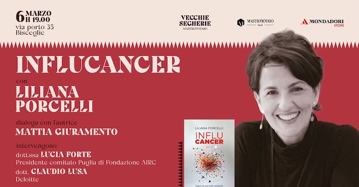Si parte venerdì 6 marzo, alle ore 19, con la presentazione di “InfluCancer” (Piemme) di Liliana Porcelli. Un libro che nasce da un’esperienza di malattia vissuta in prima persona e che trasforma il racconto individuale in consapevolezza collettiva. I proventi del volume sono devoluti alla Fondazione AIRC. Dialoga con l’autrice Mattia Giuramento; intervengono la dott.ssa Lucia Forte, presidente comitato Puglia della Fondazione AIRC e il dottor Claudio Lusa di Deloitte.