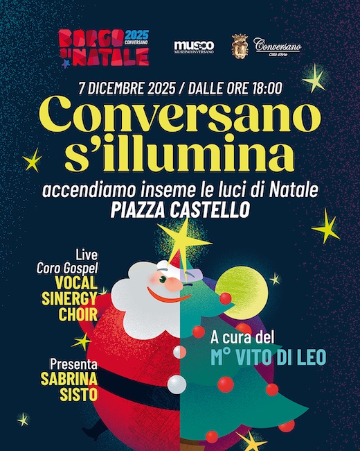 L’inaugurazione prenderà il via alle 18:00 con il raduno del pubblico in Piazza Castello e il momento simbolico dell’intera manifestazione: la cerimonia di accensione delle luminarie natalizie, che quest’anno renderanno Conversano ancora più suggestiva e luminosa. A seguire l’atmosfera si scalderà con l’esibizione del coro Gospel “Vocal Sinergy Choir”, che proseguirà fino a sera, dando così il benvenuto ufficiale al periodo più atteso dell’anno.