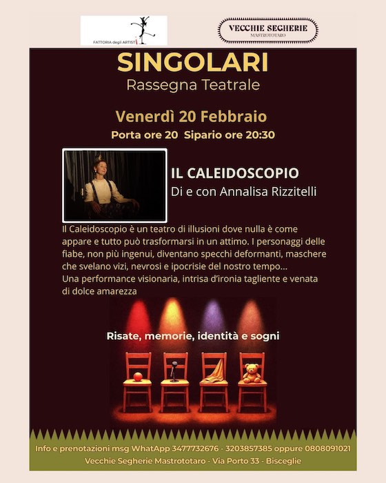BISCEGLIE – Prosegue anche alle Vecchie Segherie Mastrototaro di Bisceglie la rassegna teatrale “Singolari”, a cura di Giambattista Rossi. Venerdì 20 febbraio, alle ore 20.00 (sipario ore 20:30) andrà in scena “Il Caleidoscopio”, uno spettacolo scritto e interpretato da Annalisa Rizzitelli.