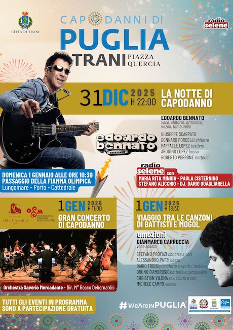 Nelle prime ore del 2026 gli assonnati pionieri del nuovo anno, si possono concedere, sempre in Piazza Quercia, l’emozionante transito della Fiaccola olimpica in terra di Puglia, dalle ore 10:30. La fiamma più celebre dello sport passa sul lungomare e lambisce il porto e la meravigliosa cattedrale, poco prima del Gran concerto di Capodanno (dalle ore 11:00) a cura della Fondazione Aldo Ciccolini ETS di Trani che per questo primo evento del 2026 si è avvalsa dei valenti musicisti dell’Orchestra Saverio Mercadante di Altamura, diretti dal M° Rocco Debernardis. Un affascinante viaggio attraverso un repertorio orchestrale, che spazia da opere iconiche a brani più leggeri. Ogni spartito selezionato porta con sé una ricca eredità culturale e musicale, permettendo agli ascoltatori di immergersi in un’atmosfera avvolgente, cullati dalle soavi note.