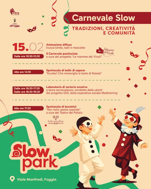 Carnevale allo “Slow Park” di Foggia tra “Tradizioni, creatività e comunità”. Una giornata da vivere all’insegna di laboratori esperienziali, pratiche artistiche e spettacoli dal vivo organizzati dal consorzio di cooperative sociali Oltre che gestisce la struttura di proprietà comunale in viale Manfredi, in adiacenza al Nodo Intermodale della stazione di Foggia.