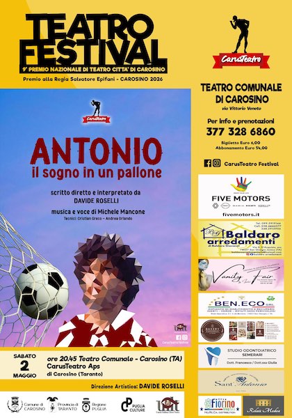 È una nuova produzione di CarusTeatro Aps che, con la partecipazione del musicista e cantante Michele Mancone, narra la storia di Antonio Miglietta, un ragazzo come tanti di Carosino che, come tanti coetanei, rincorreva un sogno.