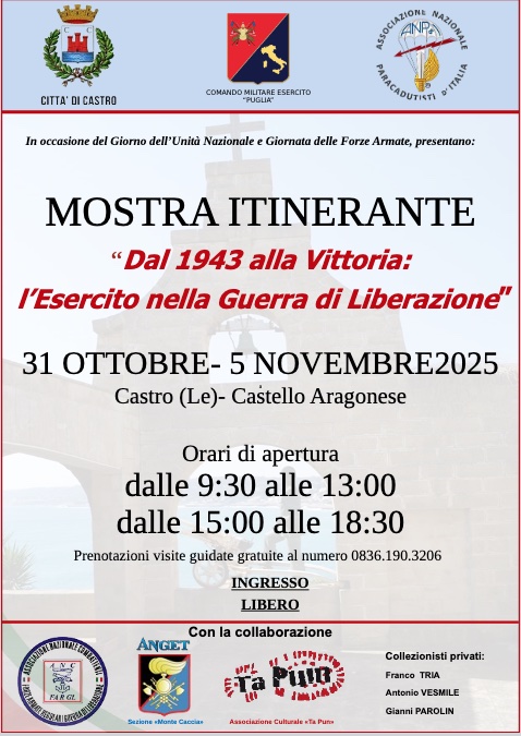 sarà inaugurata nel Castello di Castro e Museo Archeologico (MAC), la mostra itinerante dal titolo: “Dal 1943 alla Vittoria: l’Esercito nella Guerra di Liberazione” L’esposizione – curata dal Comando Militare Esercito (CME) Puglia in sinergia con la Città di Castro, con l’Associazione Nazionale Combattenti delle Forze Armate Regolari nella Guerra di Liberazione (ANCFARGL), con l’Associazione Nazionale Genieri e Trasmettitori (ANGeT Sez. Monte Caccia) e con alcuni collezionisti privati – propone pannelli didattici, documenti e cimeli, divise e scritti originali di combattenti al fronte rivolti alle loro famiglie, e storie di donne che in quel periodo si distinsero per fatti d’arme.