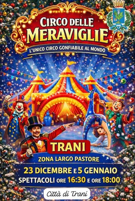Nel ricco cartellone de Le Vie del Natale, il programma di eventi promosso dalla Città di Trani, arriva un’iniziativa capace di sorprendere e coinvolgere il pubblico di tutte le età: Il Circo delle Meraviglie, il primo e unico circo gonfiabile al mondo, una struttura scenografica e completamente riscaldata che ospita spettacoli, giochi e momenti di interazione pensati per famiglie e bambini. Un’attrazione mai presentata in alcuna città.