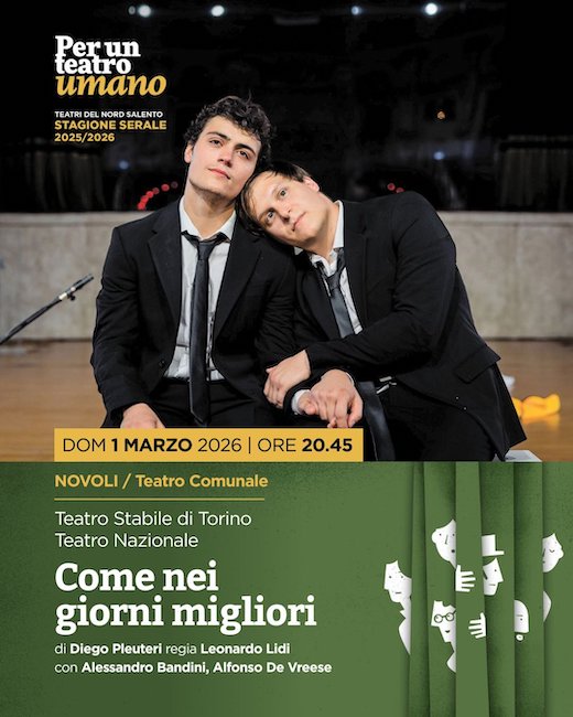 NOVOLI – Una storia d’amore quotidiana, ironica e disarmante, tra parole che diventano teatro vivo. Domenica 1 marzo (ore 20:45 | ingresso 10 – 8 euro) al Teatro Comunale di Novoli la stagione Per un teatro umano, inserita nel progetto Teatri del Nord Salento, ospita Come nei giorni migliori, produzione del Teatro Stabile di Torino – Teatro Nazionale. Brillante opera prima del giovane drammaturgo Diego Pleuteri, diretta da Leonardo Lidi, considerato tra le voci più interessanti della nuova regia italiana.