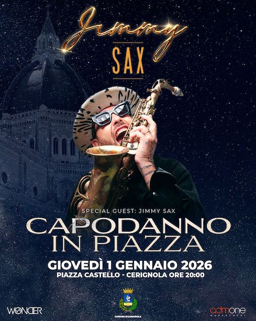 CERIGNOLA – Un concerto con una star internazionale per iniziare il nuovo anno tra musica e divertimento. Il primo gennaio 2026, nell’insolita e suggestiva location di Piazza Castello in Corso Gramsci a Cerignola, a partire dalle ore 20:00, Jimmy Sax accompagnerà la città nel saluto al primo giorno del 2026.