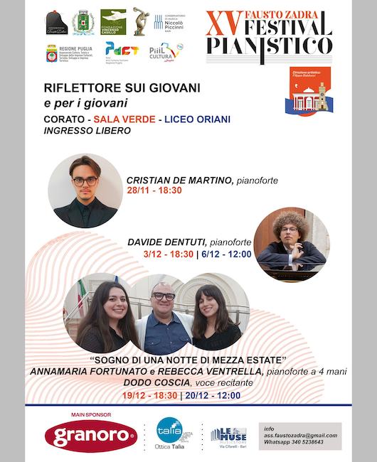 Venerdì 28 novembre, nella Sala Verde del Comune di Corato per Giovani talenti al Festival Fausto Zadra riflettori accesi su Cristian De Martino, 21enne pianista gravinese
