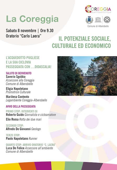 Sabato 8 novembre l’attenzione sarà rivolta a un tema di grande valore storico, ambientale e culturale: l’acquedotto pugliese e la sua ciclovia, con una particolare attenzione al loro potenziale di sviluppo socio-economico e turistico per il territorio.