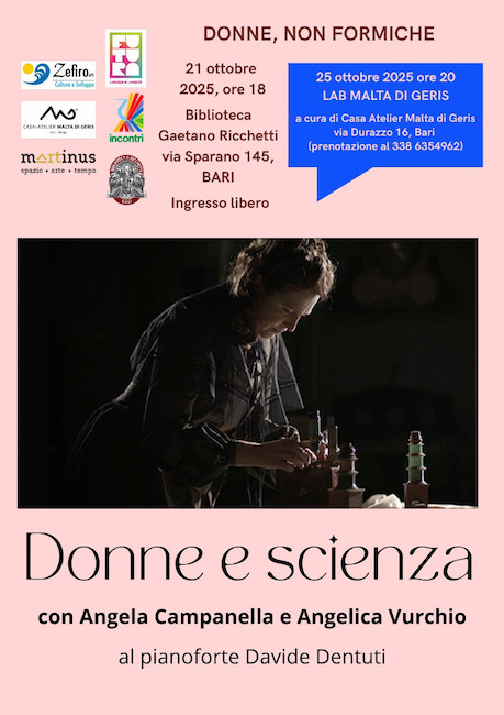 BARI – Prosegue la rassegna di eventi culturali “Donne, non formiche”, promossa da Zefiro APS in partenariato con APS Martinus Spazio Arte Tempo e APS Incontri, con un nuovo appuntamento dedicato al tema “Donne e scienza”, in programma a Bari martedì 21 ottobre 2025 alle ore 18.00 presso la Biblioteca Gaetano Ricchetti, in via Sparano 145.