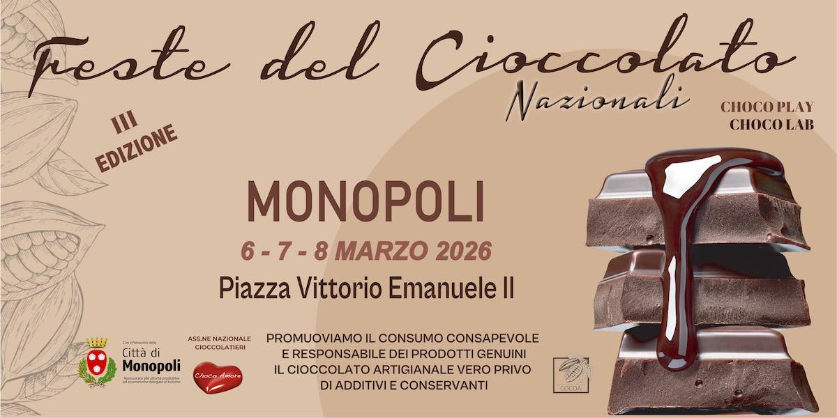 MONOPOLI – Dal 6 all’8 marzo 2026 Piazza Vittorio Emanuele II a Monopoli si trasformerà, grazie al prezioso patrocinio del Comune, in una grande cioccolateria a cielo aperto con la Festa del Cioccolato.