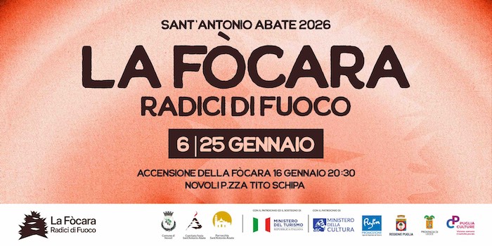 NOVOLI (LE) – Dal 6 al 25 gennaio a Novoli torna la grande FESTA di SANT’ANTONIO ABATE. Un lungo festival di oltre 40 appuntamenti tra devozione, ritualità, tradizione, cultura, arte, musica e spettacolo. Una rassegna che racconta una comunità che da secoli custodisce, tramanda e fa rivivere in un evento collettivo le sue radici di fuoco, attorno alla grandiosa Fòcara riconosciuta come uno dei più grandi falò rituali tradizionali del mondo e la grande devozione al suo santo protettore.