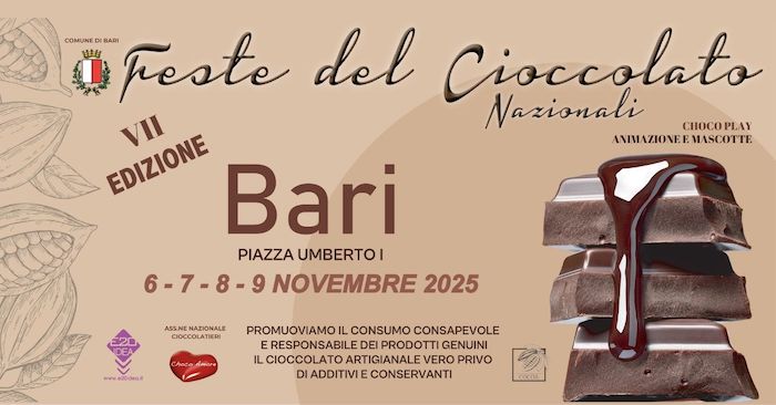 Dal 6 al 9 novembre, in piazza Umberto, a Bari, i Maestri Cioccolatieri provenienti da tutta Italia presenteranno le loro creazioni, offrendo un viaggio indimenticabile tra sapori autentici e lavorazioni artistiche