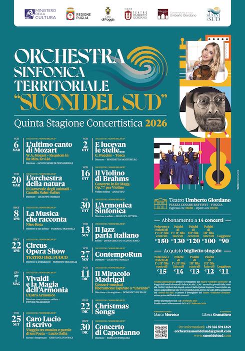 La stagione guarderà anche al pubblico più giovane con “L’Orchestra della natura”, che propone “Il Carnevale degli animali” di Camille Saint‑Saëns, diretto da Giuseppe Fabrizio (20 marzo), e con il musical “Il Miracolo Madrigal”, concert‑musical liberamente ispirato a Encanto, diretto e arrangiato da Domenico de Biase (11 dicembre).