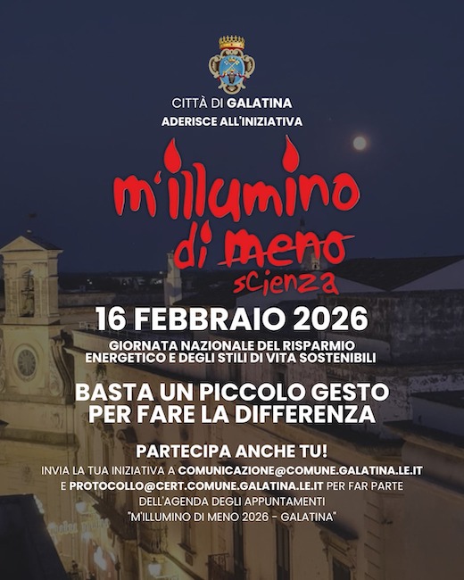 GALATINA – La Città di Galatina, anche quest’anno aderisce, per il terzo anno consecutivo, all’iniziativa “M’Illumino di Meno”, nata all’interno della trasmissione radiofonica Caterpillar e promossa da Rai Radio2 , che giunge alla XXII edizione e pone al centro il tema della Scienza come elemento per ridurre gli sprechi energetici.