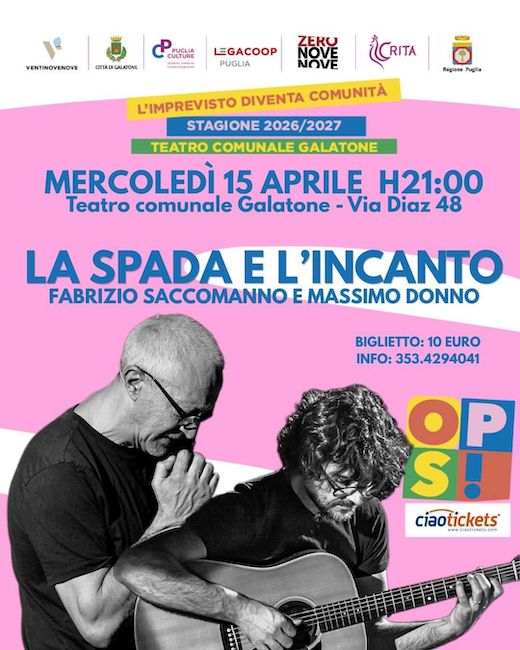 Il 15 aprile Fabrizio Saccomanno e Massimo Donno con “La spada e l’incanto” saranno gli ospiti del secondo appuntamento di “OPS! L’imprevisto diventa comunità”, rassegna presso il Teatro Comunale di Galatone