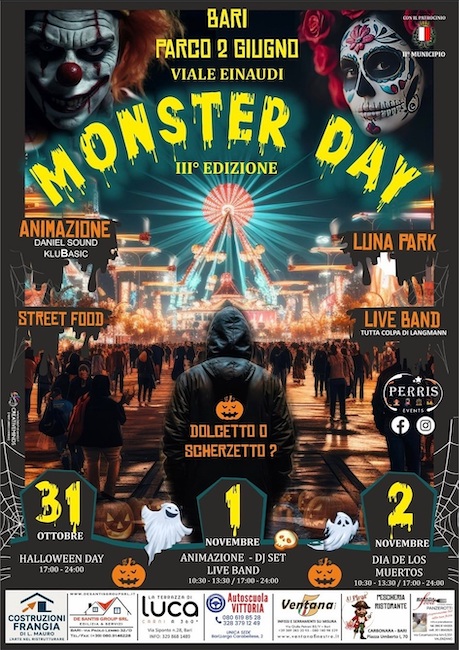 BARI – Da venerdì 31 ottobre a domenica 2 novembre a Bari, in viale Einaudi nella zona antistante l’ingresso di parco 2 Giugno, si terrà la III edizione di “Monster Day”, la grande festa di Halloween organizzata da Parris Events, in collaborazione con Perris Park e dal Gomma Park di Bari, col patrocinio del Municipio II del comune.