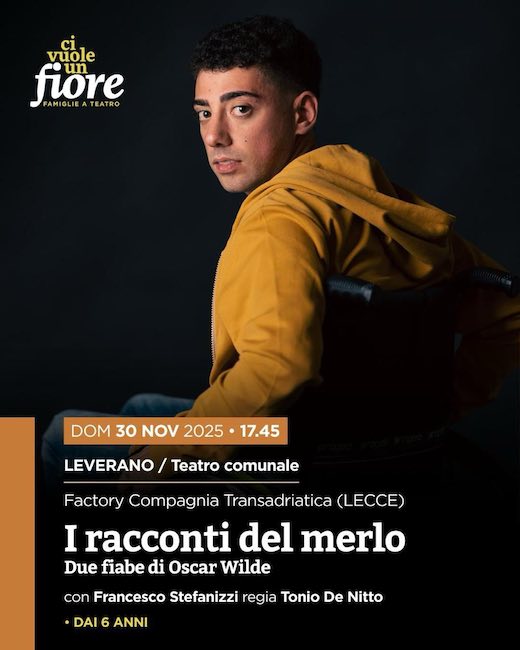LEVERANO – Domenica 30 novembre alle ore 17.45 al Teatro Comunale di Leverano la rassegna Ci vuole un fiore – Famiglie a teatro prosegue con “I racconti del merlo”, spettacolo di Factory compagnia transadriatica con Francesco Stefanizzi, per la regia di Tonio De Nitto, con musiche di Paolo Coletta, costumi di Lilian Indraccolo e luci di Davide Arsenio.