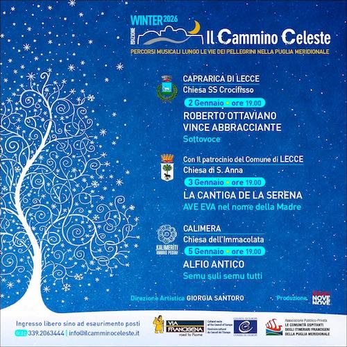 Il Cammino Celeste – Winter è organizzato in collaborazione con il Comune di Caprarica di Lecce e l’associazione Kalimeriti Ambrò Pedìa di Calimera con il patrocinio del Comune di Lecce, dell’Associazione Europea delle Vie Francigene e dell’Associazione Le Comunità ospitanti degli itinerari Francigeni della Puglia meridionale.