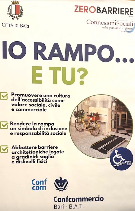 Il progetto punta ora alla creazione di una rete strutturata di diffusione e distribuzione delle rampe sull’intero territorio metropolitano, trasformando la loro adozione in un atto identitario per le attività aderenti. L’obiettivo è promuovere una cultura dell’accessibilità come valore sociale, civile e commerciale, rendendo la rampa un simbolo concreto di inclusione e responsabilità. “Io Rampo… e Tu?” si propone così come un modello replicabile, capace di coinvolgere istituzioni, associazioni di categoria e operatori economici in un percorso condiviso di sviluppo sostenibile per l’intera area metropolitana di Bari.