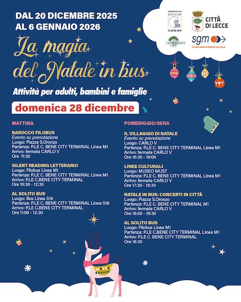 Nel pomeriggio si parte con “Il villaggio di Natale” al Castello Carlo V: fino alle 19 partenza dal city terminal di piazzale Carmelo Bene, linea M1, arrivo fermata Carlo V (evento su prenotazione). Ancora, dalle 17.30 e fino alle 18.30 “Linee culturali” al Museo Must: anche in questo caso partenza dal city terminal di piazzale Carmelo Bene, linea M1, arrivo fermata Carlo V. Alle 18 e fino alle 19.30, invece, “Natale in bus: concerti in città” in piazza Sant’Oronzo (sempre partendo dal city terminal di piazzale Carmelo Bene, linea M1, e scendendo alla fermata Carlo V). Per finire, alle 18.30 appuntamento “Al solito bus” sul filobus della linea M1, ma stavolta partendo dal city terminal e tornando nello stesso luogo.