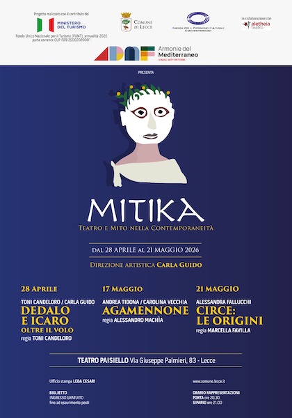 Tre gli appuntamenti, tutti gratuiti, previsti al Teatro Paisiello di Lecce il 28 aprile, il 17 e il 21 maggio (sipario alle 21), curati dall’associazione culturale “Aletheia Teatro”: “Dedalo e Icaro, oltre il volo”, “Agamennone” e “Circe, le origini”, produzioni che restituiscono alle grandi figure del Mito tutta la loro potenza evocativa, trasformandole in strumenti vivi e modernissimi di indagine sull’identità, sulle relazioni e sulla responsabilità individuale e collettiva. Spiega infatti la direttrice artistica Carla Guido: “Oggi come non mai c’è bisogno dell’esperienza degli antichi, di riflettere su quello che è accaduto nel passato per trarre insegnamenti per il futuro. Il Mito è proprio questo, esperienza tradotta in poesia, in tragedia del vissuto, indispensabile più che mai in questi tempi frenetici che ci privano del tempo per riflettere su ciò che accade e su ciò che ci circonda. Per imparare da ciò che abbiamo già vissuto”.