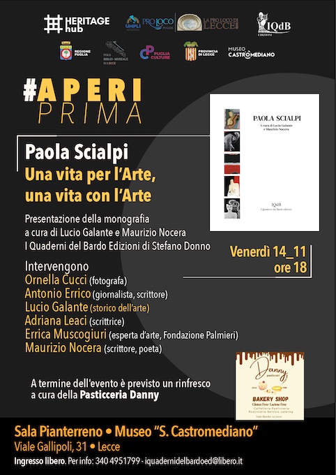 COSA: Presentazione monografia “Paola Scialpi. Una vita per l’Arte, una vita con l’Arte” DOVE: Sala Pianterreno, Museo “S. Castromediano” – Viale Gallipoli 31, Lecce QUANDO: Venerdì 14 Novembre, ore 18:00 INGRESSO: Libero e gratuito INFO: 340 4951799 | iquadernidelbardoed@libero.it