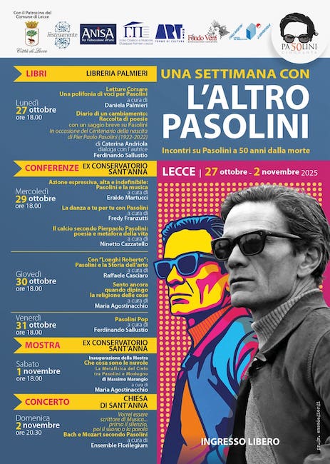 “Una settimana con l’altro Pasolini”: Incontri su Pasolini a 50 anni dalla morte presso la Libreria Palmieri, l’Ex Conservatorio Sant’Anna e la Chiesa di Sant’Anna