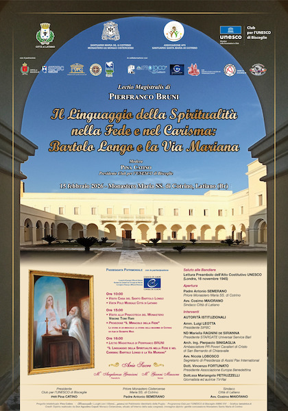 Il 15 febbraio prossimo al Monastero di Cotrino  la Lectio Magistralis dal titolo “Il Linguaggio della Spiritualità nella Fede e nel Carisma: Bartolo Longo e la Via Mariana”