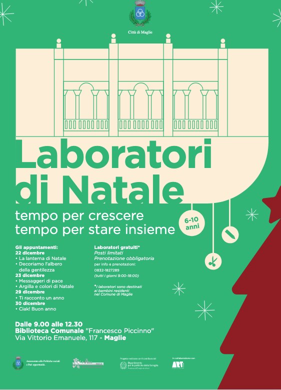 I laboratori, tutti gratuiti, sono previsti dalle 9 alle 12.30 presso la Biblioteca comunale “Francesco Piccinno” di Maglie (via Vittorio Emanuele 117) e sono in programma lunedì 22 dicembre (“La lanterna di Natale” e “Decoriamo l’albero della gentilezza”), martedì 23 dicembre (“Messaggeri di pace” e “Argilla e colori di Natale”), lunedì 29 dicembre (“Ti racconto un anno”), martedì 30 dicembre (“Ciak! Buon anno”). Posti limitati, prenotazione obbligatoria al numero 0832.1827289 (tutti i giorni dalle 9 alle 18).