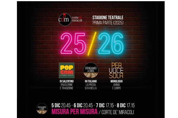 MAGLIE – Quattro appuntamenti per un omaggio a Shakespeare da domani, venerdì 5 dicembre, a lunedì 8 dicembre a Maglie, presso il teatro di Corte de’ Miracoli (via Sante Cezza 5/7). Titolo dello spettacolo, “Misura per misura”, testo del poeta nato nel 1564 a Stratford-upon-Avon tradotto, riadattato e diretto da Massimo Giordano.