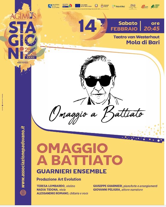 Protagonista della serata è il Guarnieri Ensemble, formazione composta da Teresa Lombardo (violino), Nadia Tidona (viola), Alessandro Romano (chitarra e voce) e Giuseppe Guarnieri (pianoforte e arrangiamenti), affiancata dalla voce narrante dell’attore Giovanni Peligra. Musica e parola si intrecciano in un progetto che non si limita a ripercorrere una carriera straordinaria, ma invita il pubblico a entrare nel mondo interiore di Battiato, tra suoni, visioni e pensiero.
