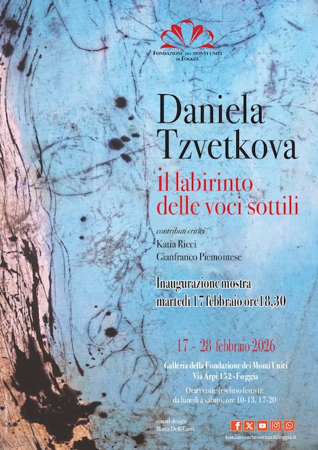 “Fin dalla sua istituzione, la Fondazione ha ritenuto che il sostegno alla produzione artistica locale non rappresenti soltanto un atto di attenzione nei confronti dei singoli autori ma costituisca una leva fondamentale per la crescita culturale, sociale e identitaria dell’intera comunità – ha sottolineato il presidente Filippo Santigliano -. Valorizzare gli artisti che dialogano con questo territorio significa, in ultima analisi, valorizzare il territorio stesso: le sue storie, le sue sensibilità, le sue trasformazioni. In questa prospettiva, l’esposizione di Daniela Tzvetkova non è un episodio isolato ma un tassello coerente di una visione più ampia che la Fondazione ha perseguito nel tempo attraverso mostre personali, collettive e progetti culturali dedicati ad artisti legati alla Capitanata. Ogni iniziativa ha contribuito a costruire un patrimonio di relazioni, riflessioni e testimonianze che oggi costituiscono un riferimento per il panorama culturale locale”.
